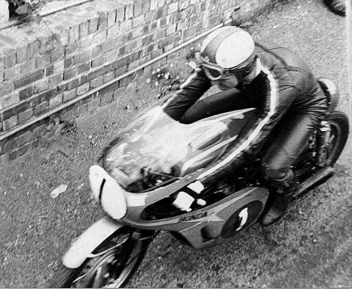 Thanks to Dave Ball for this picture of Mike Hailwood leaving the paddock at Brands on his 250 Honda 6 in 1965