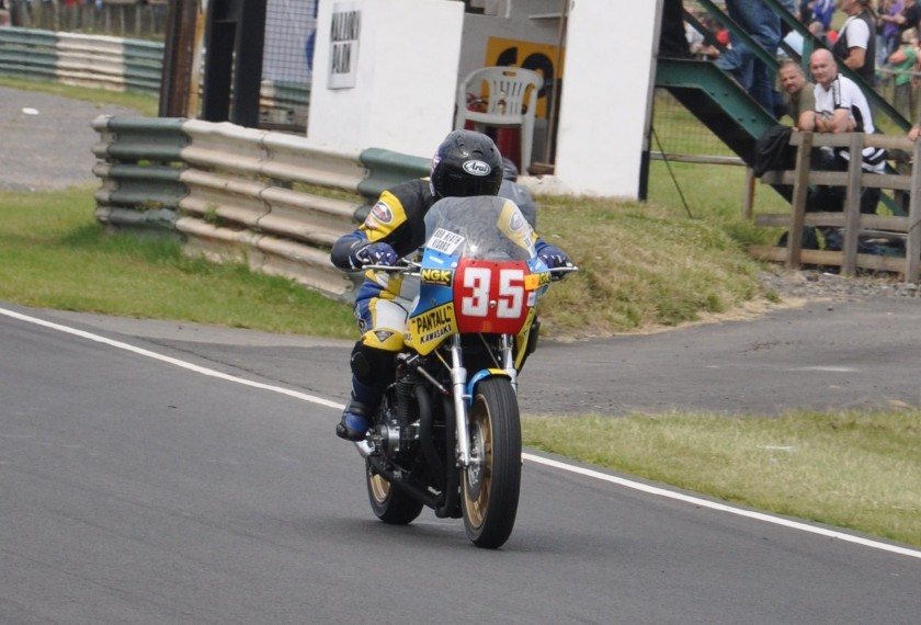 The journalist Alan Cathcart onboard Graeme Crosby’s old Moriwaki Kawasaki.