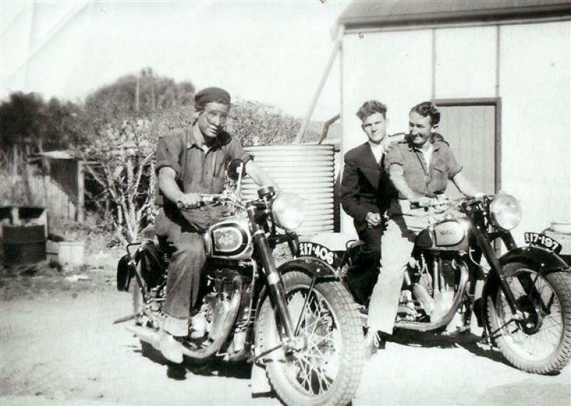 Thanks to Bryan Galpin for this nice old picture taken in 1949. "The person riding the 1948 Norton model 18 is my father Jack Galpin who purchased the bike brand new. The guy on the 1949 AJS 500 was known as Crap Man Stevens who was a mate of my Dads. They owned these bikes in Whyalla South Australia & used to race them on the Salt pans speed track just out of Whyalla most Weekends. This is what was the end of dads bike as he crashed it during a race & destroyed the front of the bike. I wish I had it now. Dad told me that his model Norton was the first model with hydraulic front forks. I cant confirm this but believe it to be true. I cant find any other photos of the model 18 before this with these type of front forks."