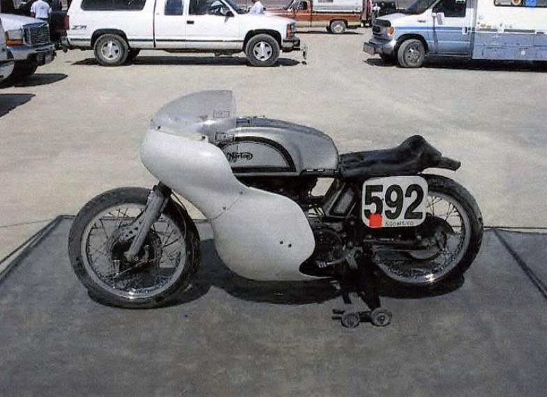 Add Your Photos!Thanks to Bill Anderson for this picture of his Norton/Weslake speciall. He built it in Ireland for vintage racing but the powers that be didn’t like the four valve idea. He moved back home to California and now uses it for land speed racing. It holds its class record at Bonneville and El Mirage dry lake. It runs on gas and its best speed to date is 129.817 mph at El Mirage dry lake.