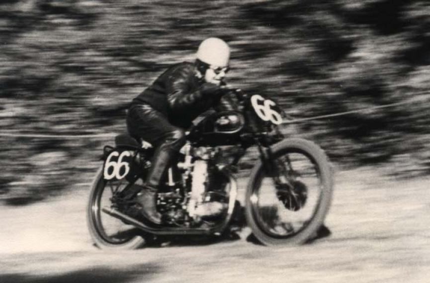 Add Your Photos!A lovely old picture sent in by a regular (and much appreciated!) contributor to the site, Andy Breeden. And thanks to Dave Vintner for identifying it as an AJS. And further thanks to Christian Gyde for indentifying it as an AJS consisting of late 20′ies parts, a typical grass track job. The frame looks like AJS light weight frame as used in various forms 1929-1935, while the engine is a bit earlier with its exposed rocker gears. And also thanks to Pat Neal for this fantastic identification: “The rider is Phil Heath, ex continental circus racer and vmcc stalwart [he had the same expression whatever he was riding]. The bike is an ex-factory AJS r10 overhead cam belonging to Mike Vangucci and the venue was Royston hillclimb, a regular feature in the sixties run and organised by my father, ex factory Scott racer, Ossie Neal…Hope this helps…..Pat“