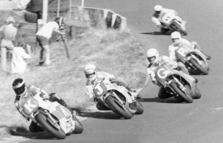 Thanks to Roger Kirby for this picture.  It was was taken at Pukekohe (near Auckland) in Dec. 1977.  The riders are "K"-Hideo Kanaya YZR750, "J"-Jeff Sayle RG500, "G"-Greg Hansford, "P"-Rick Perry (both KR750′s) & "W" is Warren Willing TZ750. Taken during aseries of international races sponsored by Marlboro over the christmas period (mid December to mid Jan.) in New Zealand.