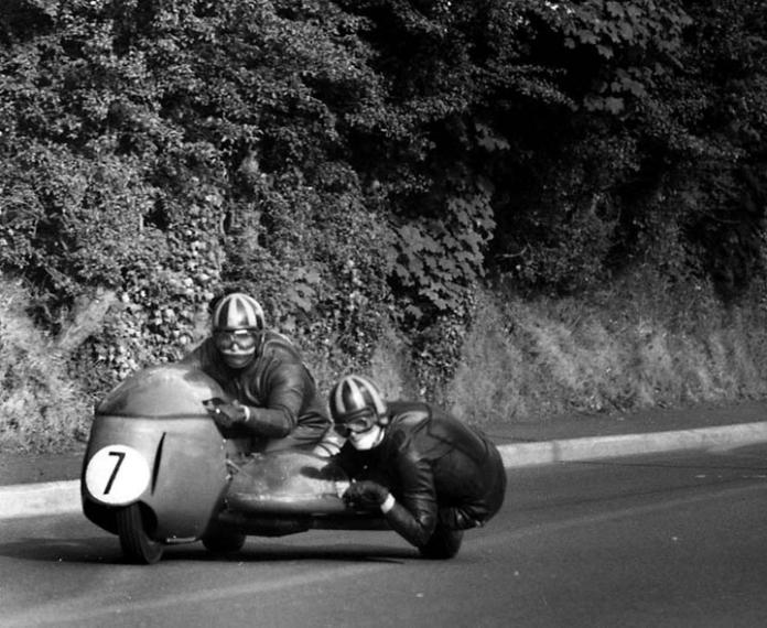 Roy Hanks driving at Greeba Bridge on the Isle of Man in 1969. Thanks to Bill Dobson for the picture.