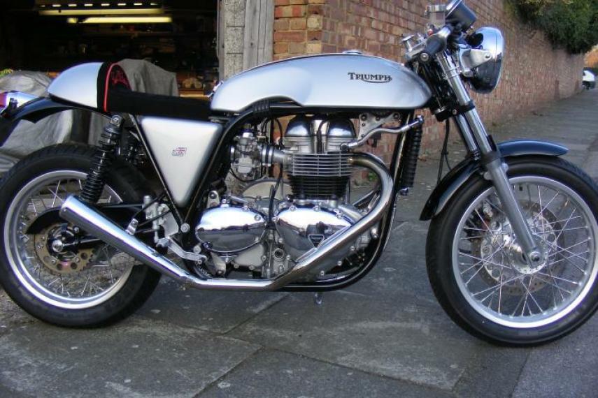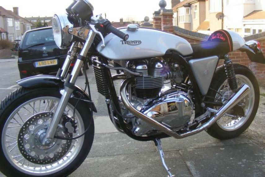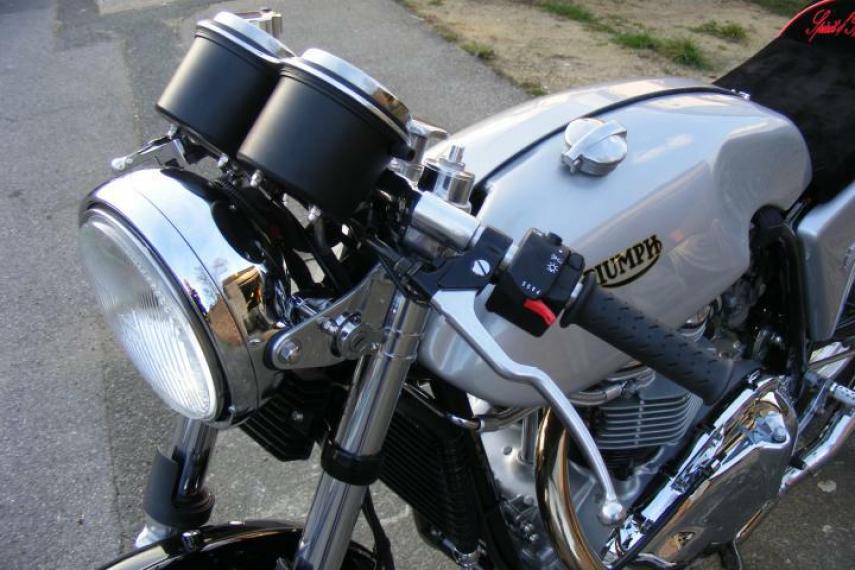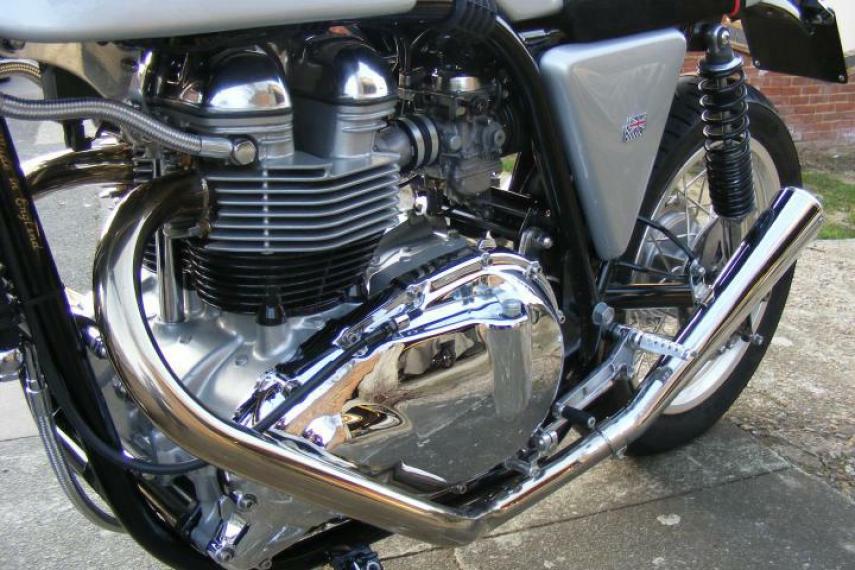 “The Triumph is the fourth in a series I have built it capturing The Spirit of the Sixties as the machine’s names suggests. I have endeavoured to build the very best machines with no expense spared. Over the past seven months I have created my take on a retro 60`s Cafe Racer. I had looked at the T100 engine about three years ago and considered building a special but having built a Unit construction Triton and a 500cc Norvin, I decided to build my 1000cc Norvin”Spirit of the Sixties 3″ instead. Having finished it, I started to think of what to build next when this project came up. It consisted of the engine, the rolling chassis and that was about it. The owner had lost interest but I could see what it could look like finished so I purchased it. I dry built the machine carrying out frame mods for exhaust mounts, steering stops, side panel mounts etc. I sourced all the electrics and modified the loom to suit. The list is endless. The engine itself is 855cc, with 200miles on the clock.Its De-restricted with gas flowed and ported head. The swept back pipes were purchased and modified as they were for a standard Hinkley and therefore needed cutting and shortening and re-welding to get them to fit correctly and mate up with the silencers.Manx tank,seat and side panels were made locally and painted by a friend. When the dry build was finished I stripped the machine down had the powder coating removed as the welding had taken its toll and re coated, why people put paint on a machine before finishing the dry build is a mystery to me. All the polishing and metal work I do my self as well as the designing etc. There is far to much detail in this machine to cover here but I hope this gives you a flavour. The build quality of all my specials are second to none. I see this type of special as the way forward as Vincent engines are at best unobtainable even if you have cash on your hip, £10,000 won`t buy an engine these days,but you can build machines like this for that money. As the age profile including myself who remember the sixties find it harder to kick over large capacity machines what better than an British engined Cafe Racer with electric start etc”
