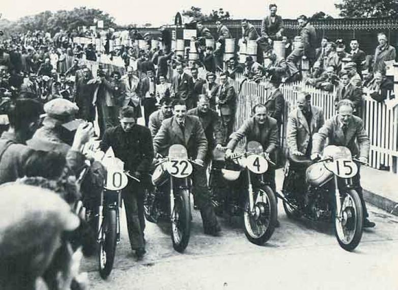 Thanks to Dave Martin for this picture of the 1949 AJS team. They are, from left to right, Armstrong, Doran, Graham and Frend
