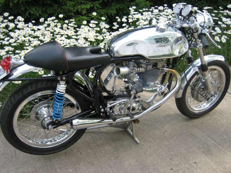 Thanks to George Rudisill of Ohio for this picture of his fine Triton.  George says "It was a four year project. Norton Slim line frame got things started, with betor front forks hooked to a 4ls Suzuki hub. Akront 18 in. wheels front and rear. The rear hub is Triumph conical. That’s about it for the roller. Power Plant is T-110 cases with a late crank, and 3134 cams on intake and exhaust. Early 650 8 bolt cylinder and t-120 head with a couple 32 mics to breath through. BTH makes the sparks. Power to the trans via Map belt drive. The trans is Triumph 4 speed box loaded with a 78 5 speed gear set. Battery box is behind the trans, out of site. Clip ons, oil and fuel tank are from UK. Only 100 miles so far without any Leaks or problems. Time will tell….!"