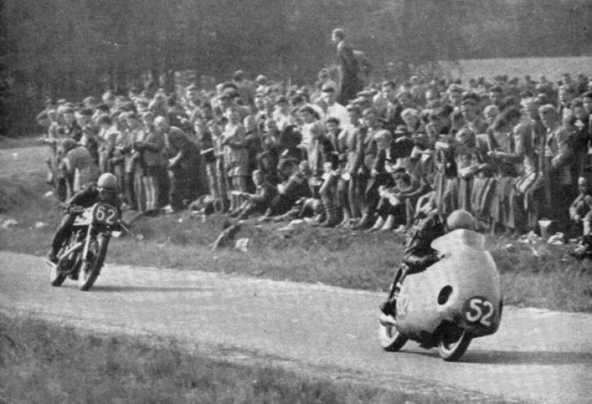 Thanks to Aad Weers of the Netherlands for this picture of the 350cc race in Tubbergen in the East of Holland in 1956. The riders are: Nr. 52 Bob Mathews Velocette KTT MK8 Nr. 62 Lo Simons Norton Manx