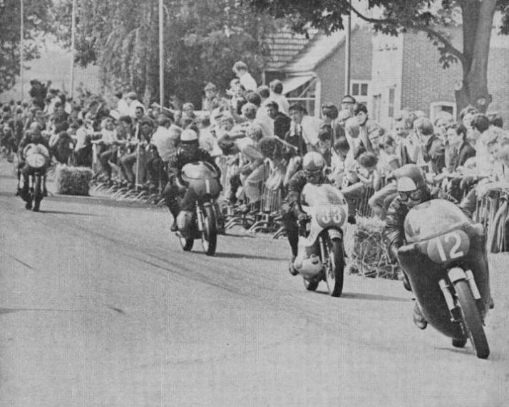 Thanks to Aad Weers of the Netherlands for this picture of the 350cc race in Tubbergen in the East of Holland in 1968. The riders are: Nr.12 Rob Fitton  Norton Nr.33 Cees van Dongen  Yamaha Nr.1  Karl Hoppe  Aermacchi Nr.15 Godfrey Nash  Norton