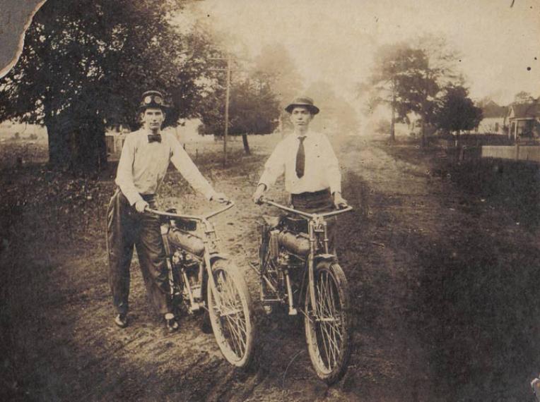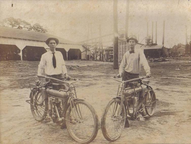 Very many thanks to Lynn Jones of the US for sending these superb pictures.  They show her grandfather and his cousin taken in 1906 with their motorcycles.  The first picture shows her great-uncle, Leslie Hamner, and was taken at a sawmill in Gibsland, Louisiana. The second picture is of her grandfather, Matthew Morgan Hamner, Sr. Many thanks to Max for the following clarification on the year of this picture (previously thought to be 1906): "If you look very closely at the Frame on each Yale you will see that the top frame tube drops down just after the head-stem casting, this was done to lower the frame and seat height, but was only ever offered for the 1910 Yale selling year , the very same year the first 6 ½ HP V-Twin Yale appeared also with the drop down frame , standard finish being gray with navy-blue pin-stripping. Because the Yale’s featured did not exist before 1910 nor did the photograph."