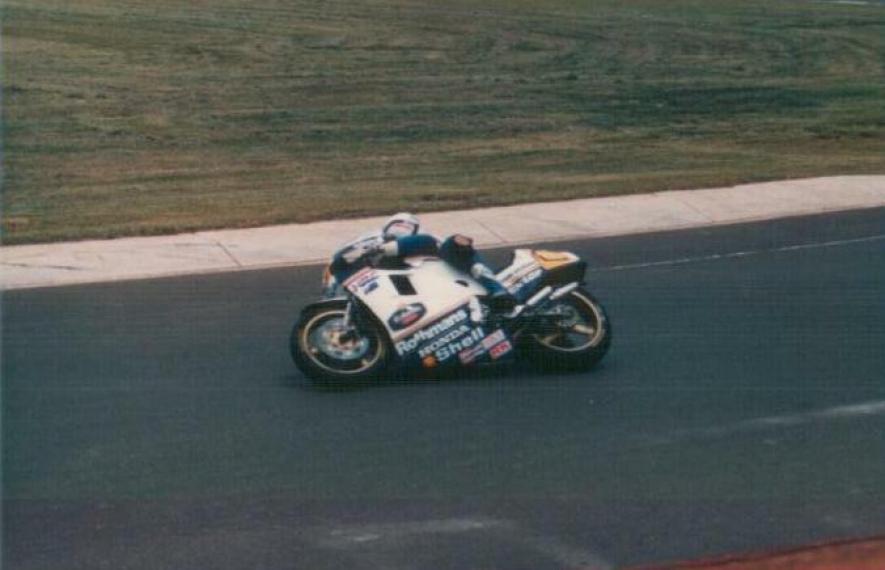 Thanks to John Haden for this picture of Wayne Gardner on board the factory Rothmans Honda bike in Australia about mid ’80s during the Swann series.